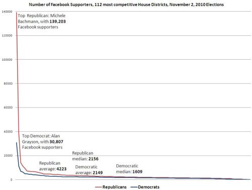 Virtually all candidates involved in competitive races in the 2010 midterm elections in the US used Facebook. Together with my colleague Cristian Vaccari from the University of Bologna, I have collected data on the number of supporters of each Democratic and Republican candidate for the House of Representatives in the 112 most competitive districts (see end for sample).