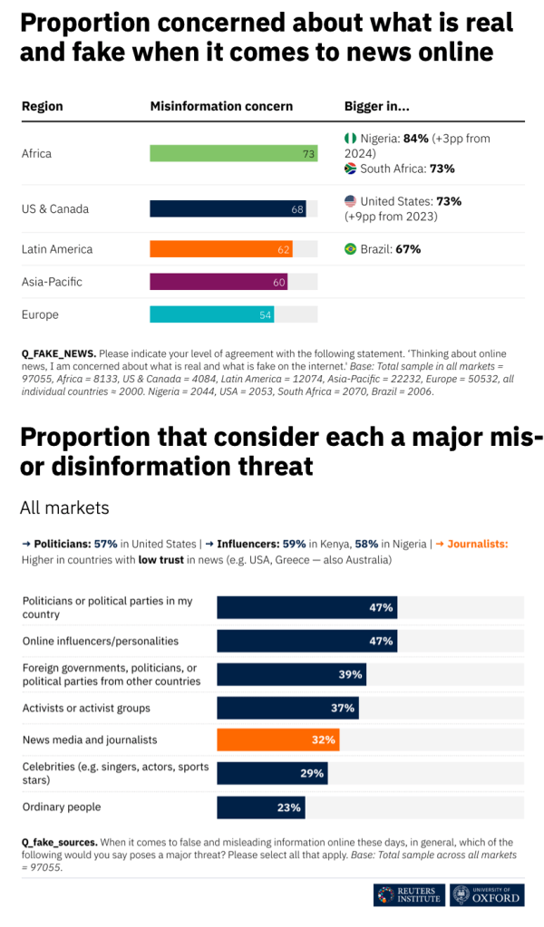 “Alternative media voices often have a wide reach and appeal to audiences that news publishers have been keen to engage with but the report also shows that, when it comes to underlying sources of false or misleading information, online influencers and personalities are seen as the biggest threat worldwide along with national politicians”, Mitali Mukherjee writes in her introduction to the 2025 Digital News Report.