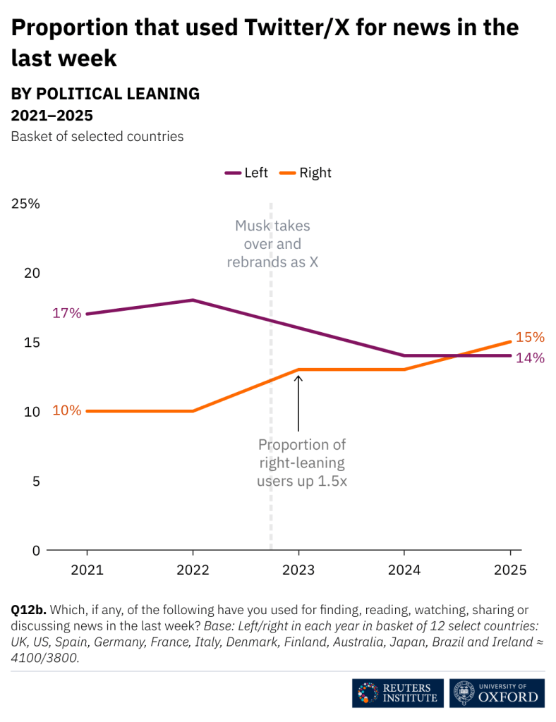 While industry data suggests X is much diminished in terms of how intensely it is used, survey data on weekly use – perhaps surprisingly – suggests stable reach overall. A liberal exodus seems to have been matched by a growing number of right-wing users, and after many years of having a predominantly left-wing user base, X now has slightly more right-wing users.