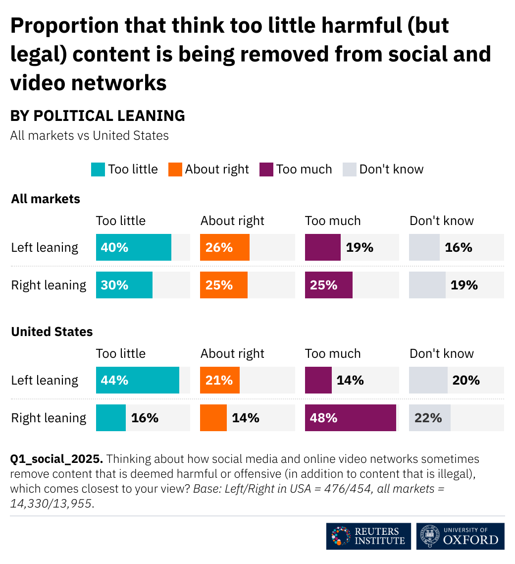 First Elon Musk and later Mark Zuckerberg has said they want to reduce how much content is subject to moderation on their platforms – while some political actors may applaud this, it is not clear the public does. A plurality in many countries say they want more harmful or offensive content removed from social media.
