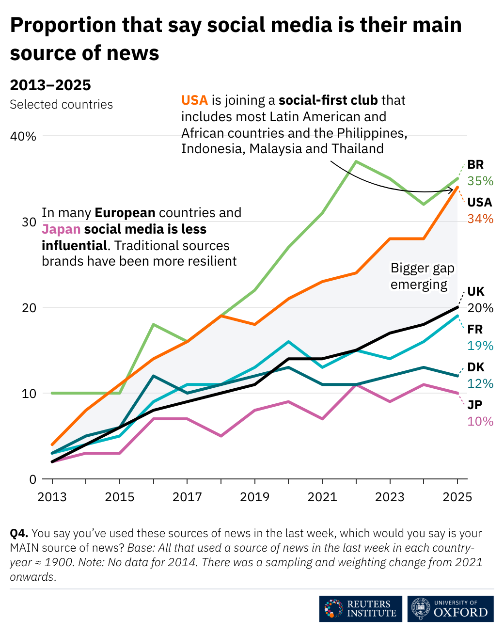 All that and more in the 2025 Digital News Report, with topical chapters, country pages, interactive data, and more on the Reuters Institute website – an incredible team effort that I am proud to be part of.
