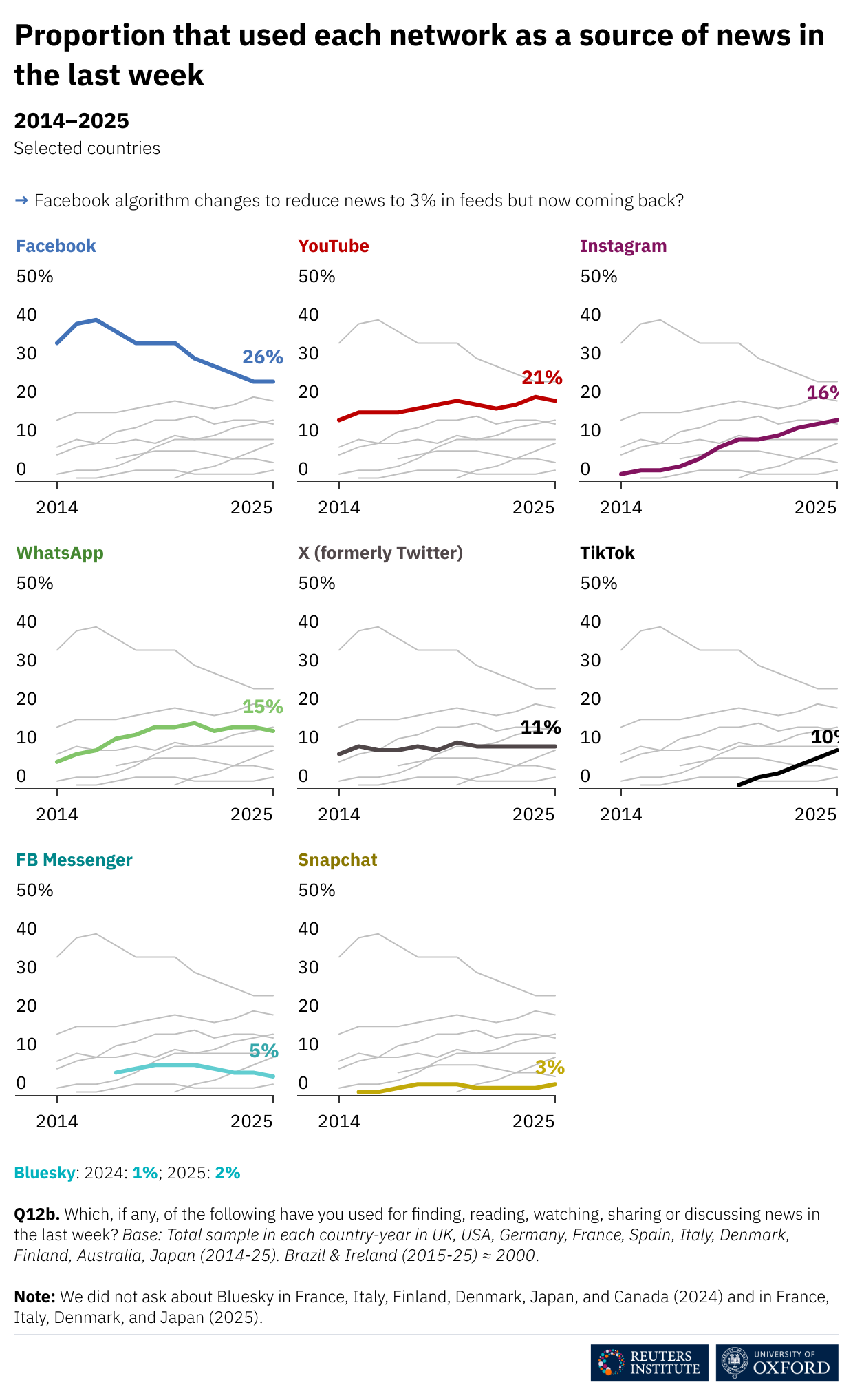 In the report, we document how platforms are increasingly central to how many find and access all sorts of content, including news, as well as a continued fragmentation of the platform space. There are now six networks with weekly news reach of 10% or more compared with just two a decade ago. Instagram, WhatApp, and TikTok in particular have grown in importance, whereas BlueSky still only has tiny reach amount our respondents.