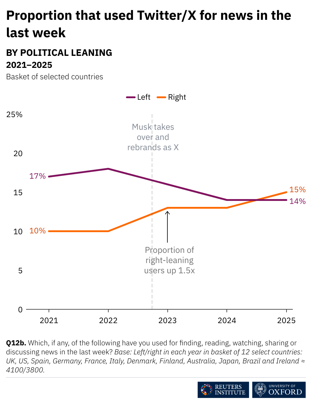 While industry data suggests X is much diminished in terms of how intensely it is used, survey data on weekly use – perhaps surprisingly – suggests stable reach overall. A liberal exodus seems to have been matched by a growing number of right-wing users, and after many years of having a predominantly left-wing user base, X now has slightly more right-wing users.