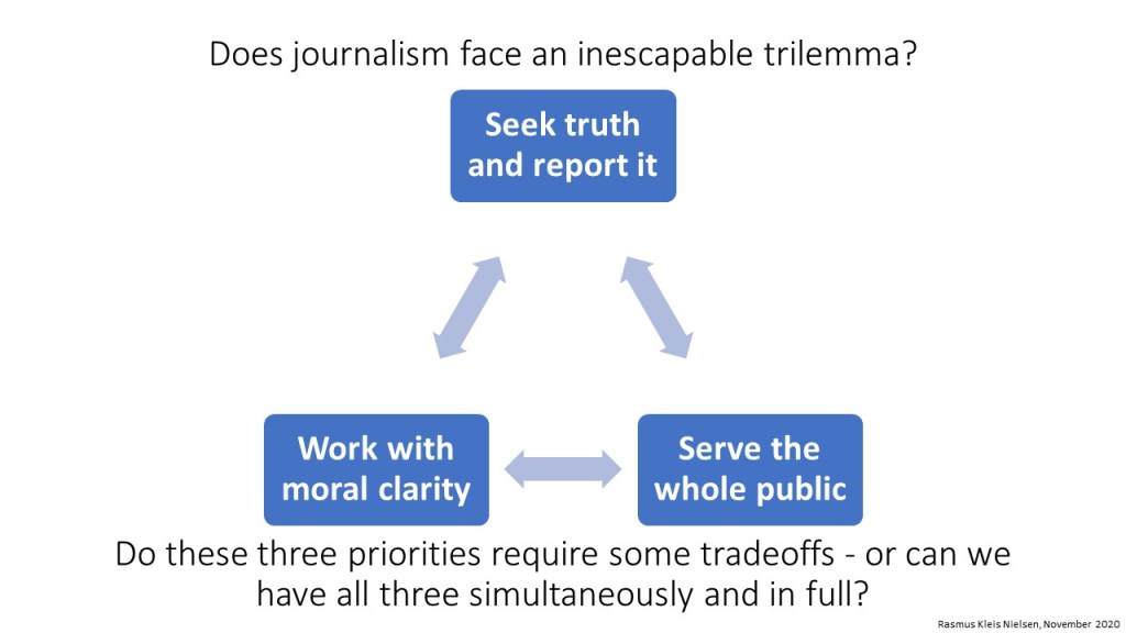 We try to do this while remaining both respectful of the history and track record of actually existing journalism, what Candis and Young call “prior journalisms”, without being beholden to it or blind to its many limitations. As I wrote when I took over as Director of the Reuters Institute in 2018, we are not here to help people go back to the journalisms of yesterday, but to work with journalists from around the world as they build towards better journalisms for tomorrow, whether that is Adesola Akindele-Afolabi thinking about how financial journalism in Nigeria can serve poor people better, Camilla Marie Nielsen from Ekstra Bladet, a popular title akin to the Daily News of old, develop ways of reporting on sexual abuse to fatigued audiences, Tejas Harad analysing the barriers Bahujan journalists face in Indian newsrooms, or any of the many other journalists, editors, and news media leaders we work with.