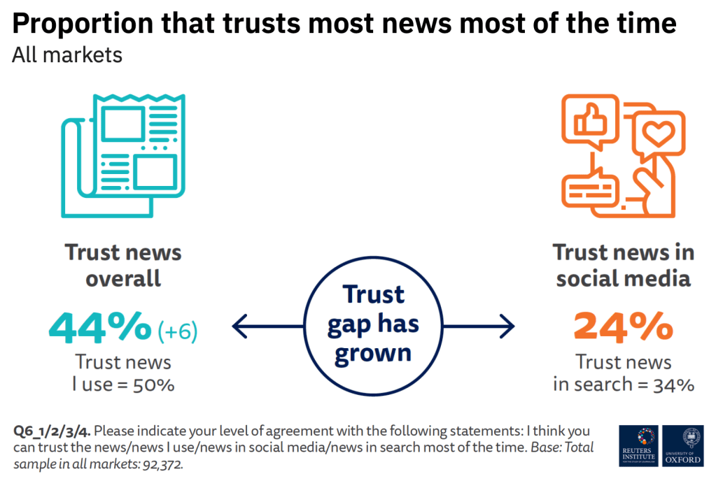 No similar growth for trust in news seen on e.g. social media means that the “trust gap” with platforms has grown.