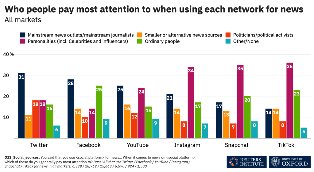 This is a promising but also tricky space for news publishers in many ways – for example, on growing networks such as TikTok, Snapchat, and Instagram, influencers and alternative sources seem to command more attention than mainstream media and journalists.