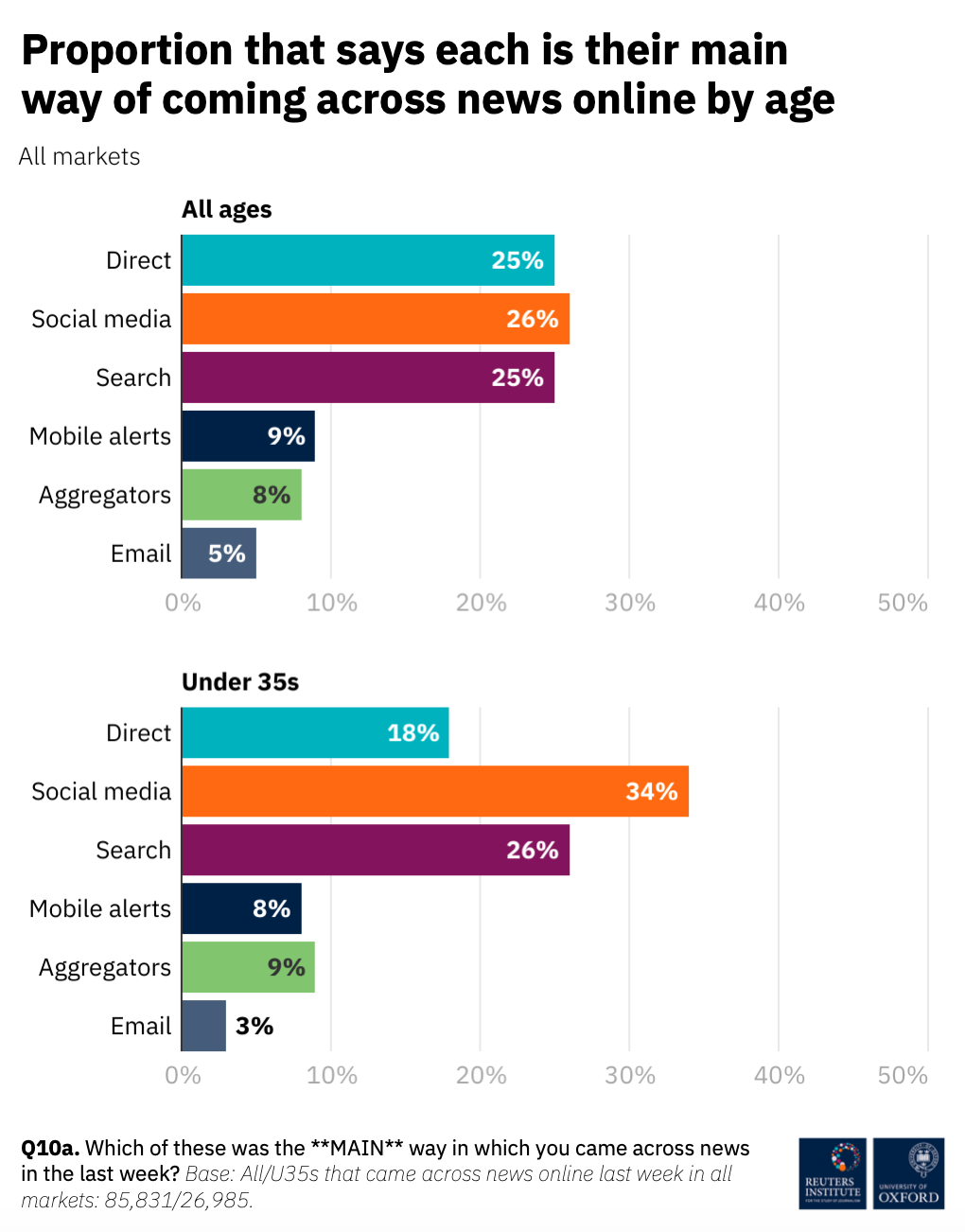 Just 25% of our respondents say going direct to a news site or app is their main way to access online news.