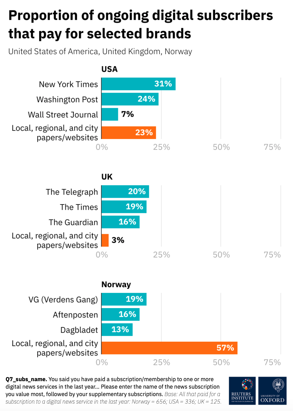 And in most countries a large proportion of digital subscriptions go to just a few big national brands, reinforcing winner-takes-most dynamics. Only in Norway do we see a large number saying they subscribe to local news online, and only in the US is the median number of digital news subscriptions now 2 (often a big national plus either a niche supplement (sports, opinion, etc.) or a local one, very rarely both).
