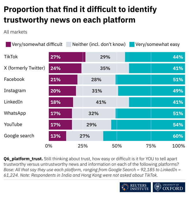 Generally, many of our respondents say they find it at least somewhat easy to tell trustworthy and untrustworthy news and information apart on various platforms, but there are real differences, with more people concerned about how to navigate information on e.g. TikTok, X, Facebook.