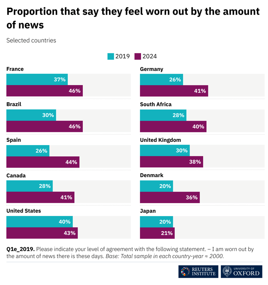 We also document the continually fraying connection between much of the public and much of the news media industry. In many markets, trust is limited, interest in news declining, and news avoidance growing. Many of our respondents say they are worn out by the amount of news, up sharply since we last asked this question in 2019.