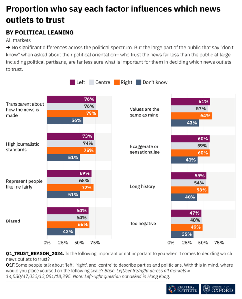 In terms of what factors are important when deciding which news outlets to trust, we show that while people come to different conclusions RE individual brands, across the political spectrum from left to right, most actually emphasize the same factors. The main difference here is not by political orientation but what political scientists call “the other divide” – the large group of people who are more distant from conventional politics (and often less privileged in terms of income and education) are less sure what, if anything, would lead them to trust a news outlet.