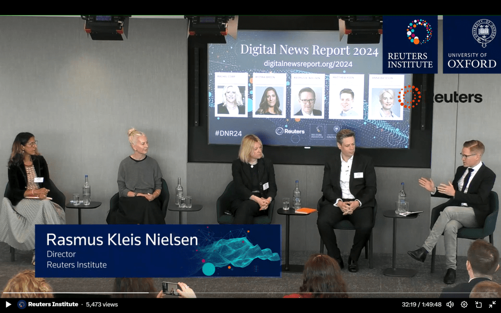 The 2024 Reuters Institute Digital News Report is out, documenting scale and scope of ‘platform resets’ and much more. It is a team effort by lead author Nic Newman, Richard Fletcher, Craig Robertson, Amy Ross, and myself, working with our country partners. The report covers 47 market accounting for more than half of the world’s population, and is made possible by our 19 funders. A real pleasure to chair the panel discussion at the global launch at Reuters News this morning, featuring Rozina Breen (editor-in-chief, The Bureau of Investigative Journalism), Anna Bateson (CEO of the Guardian Media Group), Rachel Corp (CEO of ITN), and Matthew Keen (Head of Operations and Strategy, Reuters).