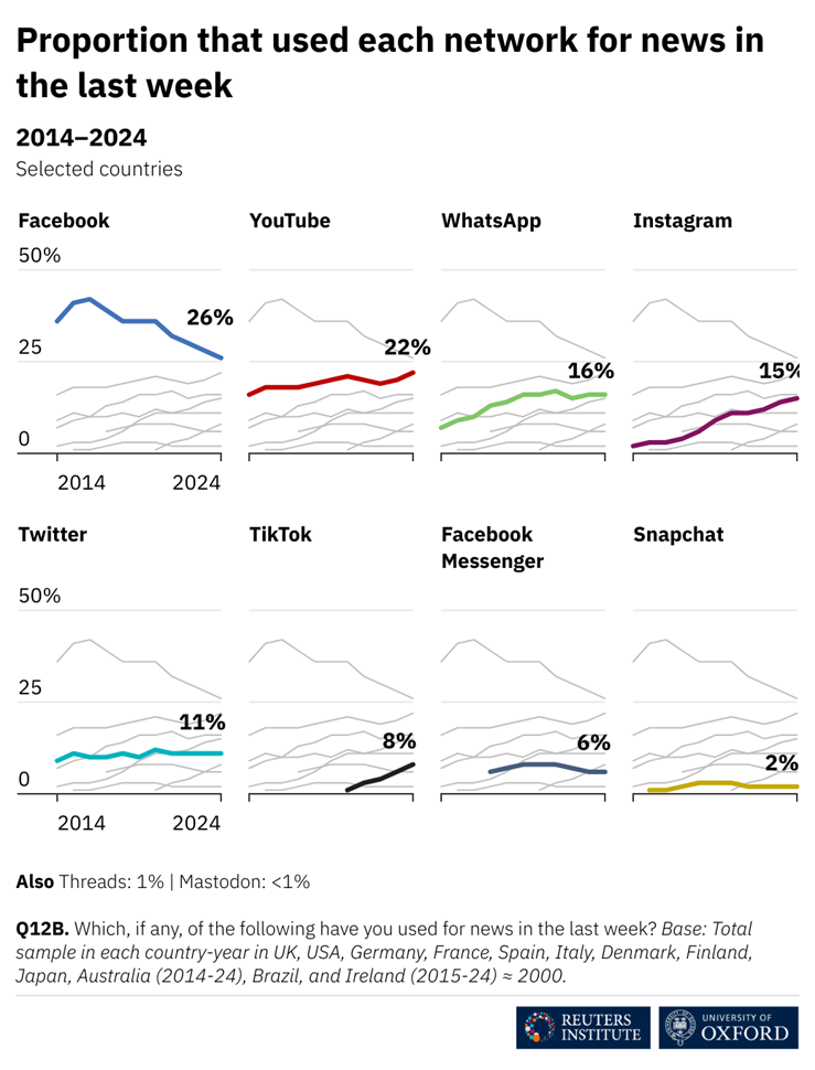 In the report, we document how platforms are increasingly central to how many find and access all sorts of content, including news, as well as a continued fragmentation of the platform space. There are now six networks with weekly news reach of 10% or more compared with just two a decade ago. Instagram, WhatApp, and TikTok in particular have grown in importance, whereas BlueSky still only has tiny reach amount our respondents.